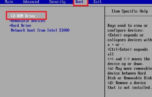 3、將第一啟動項改成cdrom,再按+鍵將cd-rom移動到第一項。