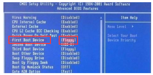 3.進入bios界面之后,找到“first boot”這個選項,再選擇“cd-rom”,這就是光驅,將其設置為啟動項。