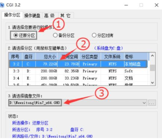 步驟二:然后鼠標雙擊操作本工具(硬盤安裝.exe),在工具主頁面選擇還原分區到主分區(C盤)(通常一般選擇),選擇GHO鏡像文件(通常自動搜索鏡像文件)即可。