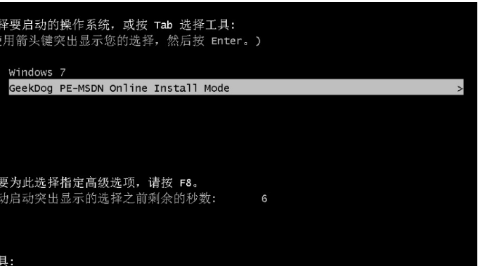 步驟五:現在極客狗下載系統文件,下載完成后電腦會自動重啟,重啟選擇PE所在項回車即可。