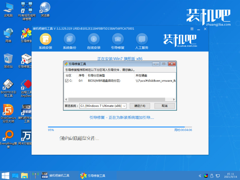 5、在pe系統內,裝機吧裝機工具開始自動安裝win7系統。