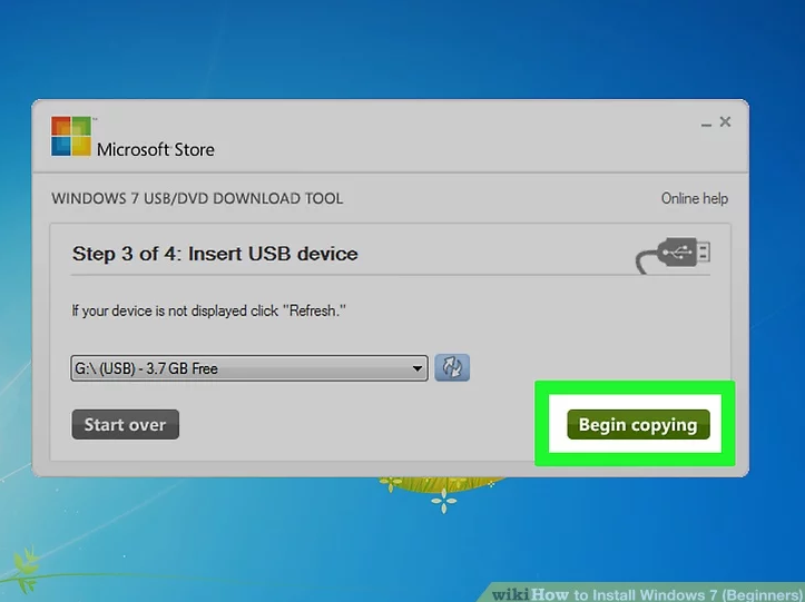 9、選擇U盤,然后單擊開始復制。使用“Step 3 of 4”屏幕上的下拉菜單選擇要將 ISO 文件復制到的 USB 驅動器,然后單擊顯示“Begin Copying”的綠色按鈕。如果您收到“可用空間不足”的錯誤消息,請單擊“擦除 USB 設備”按鈕,這將擦除驅動器上的所有文件。請注意,這將擦除閃存驅動器上的所有文件。