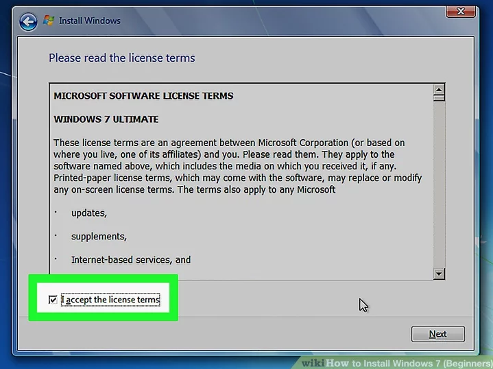 17、閱讀 Microsoft 軟件許可條款,然后單擊“我接受許可條款”旁邊的復選框。然后點擊右下角的下一步。