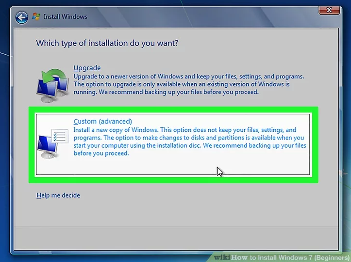 18、選擇'自定義安裝。此選項允許您全新安裝 Windows 7。這將清除安裝驅動器上的所有文件。如果您不想刪除所有文件,請選擇升級。此選項需要現有的 Windows 安裝。
