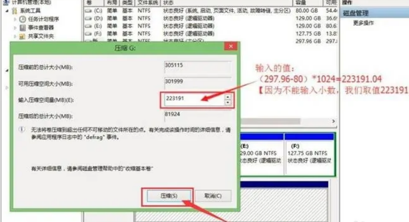 4、需要保留系統盤80GB,這個位置的值輸入=(壓縮分區大小—C盤保留大小,這里是80GB)×1024:即=(297.96-80)×1024 ,這樣就分好了。