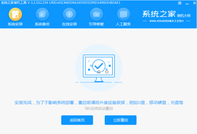 5、等待環境安裝部署完成后,重啟進入pe安裝界面。