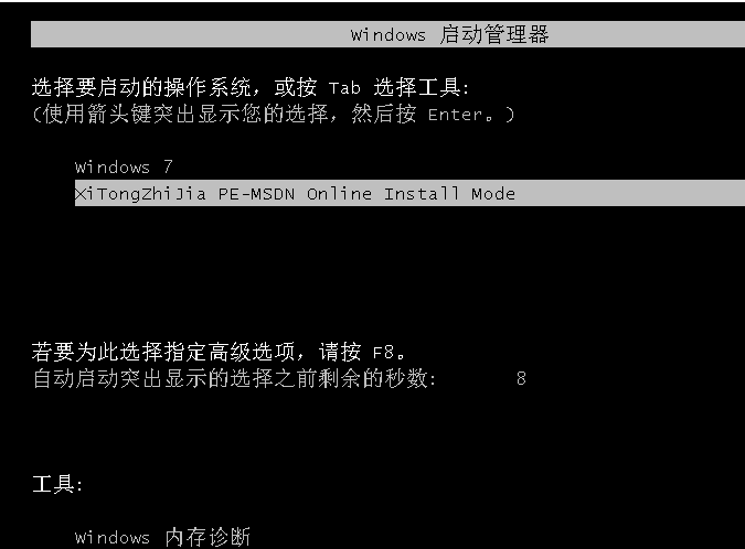 6、重啟后,選擇光標選項的內容,按Enter進入xitongzhijia pe系統。