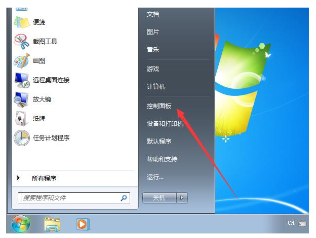 4、然后進入桌面,鼠標點擊左下角的開始才當,點擊“控制面板”。