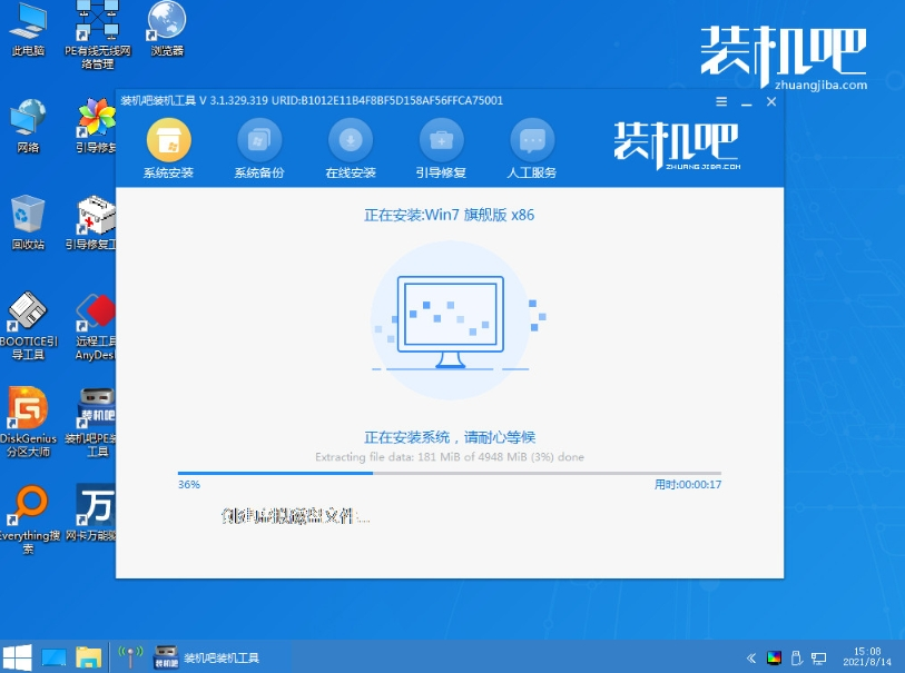 5、在pe系統桌面,打開裝機吧裝機工具選擇win7系統點擊安裝到系統盤c盤。