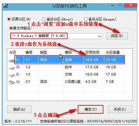 3、進入pe系統后打開工具,點擊"瀏覽",將保存在u盤的系統鏡像添加進來,接著選擇c盤作系統盤存放鏡像,點擊“確定”。