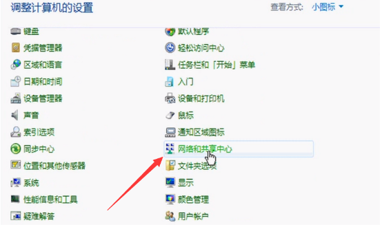 3、然后查看方式改為小圖標,選擇網絡和共享中心。