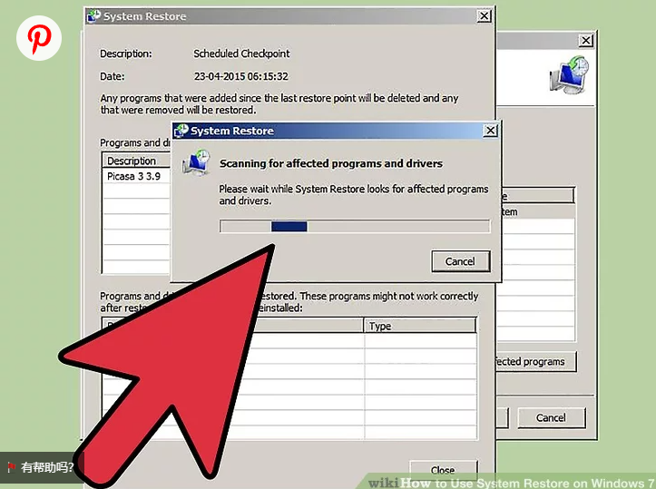 5、選擇還原點后掃描受影響的程序按鈕。 這將向您顯示將通過使用該還原點執行還原來卸載或重新安裝的所有程序和驅動程序。在此說明:創建還原點后安裝的所有程序都將被卸載,而創建還原點后卸載的所有程序都將重新安裝。