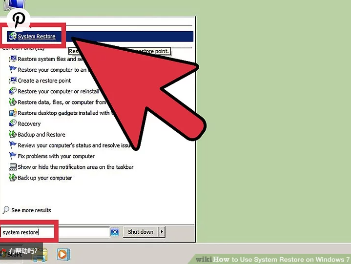 3、單擊開始菜單并在搜索框中輸入“system restore”,從搜索結果列表中選擇“系統還原”。