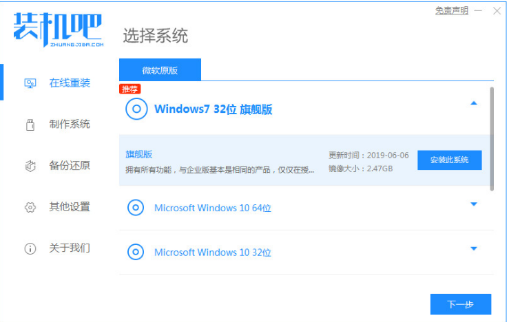 1、下載安裝裝機吧一鍵重裝系統并打開,選擇win7系統,點擊下一步。