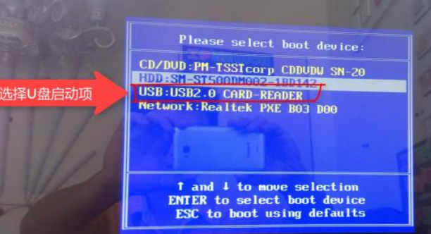 9.然后進入啟動菜單,選擇USB開頭的啟動選項或U盤的品牌名稱,選擇上下箭頭鍵,然后按Enter進行確認。