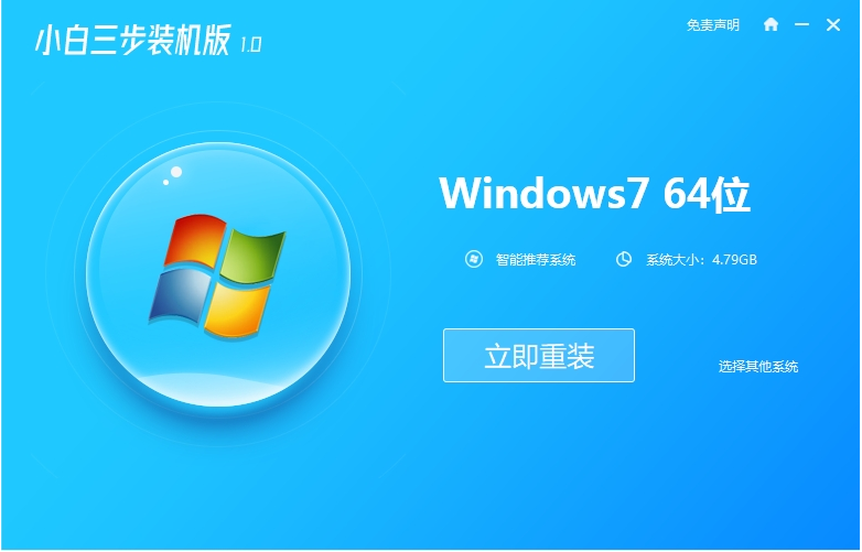 1、首先自行在電腦上搜索并下載小白三步裝機版工具,打開工具就可以選擇windows7原版系統,點擊立即重裝。