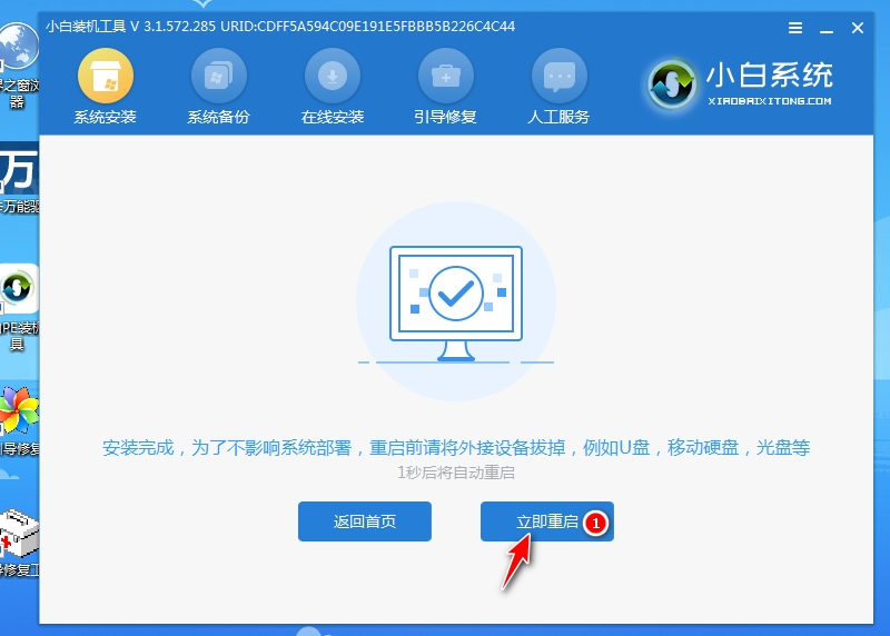 5、進入pe系統后,小白裝機工具自動打開安裝win7系統到系統盤c盤,期間會格式化c盤。等待安裝完成后,選擇重啟電腦。
