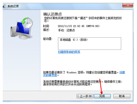 4、最后確認還原點后點擊完成即可還原系統。