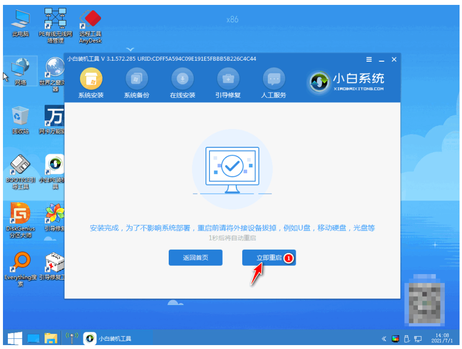 6、系統安裝完成后,然后再次選擇重啟電腦。