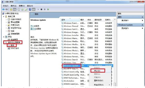 2.在計算機管理中點擊服務和應用程序-服務,然后在打開的列表中找到“Windows Update”并右鍵點擊“停止”;