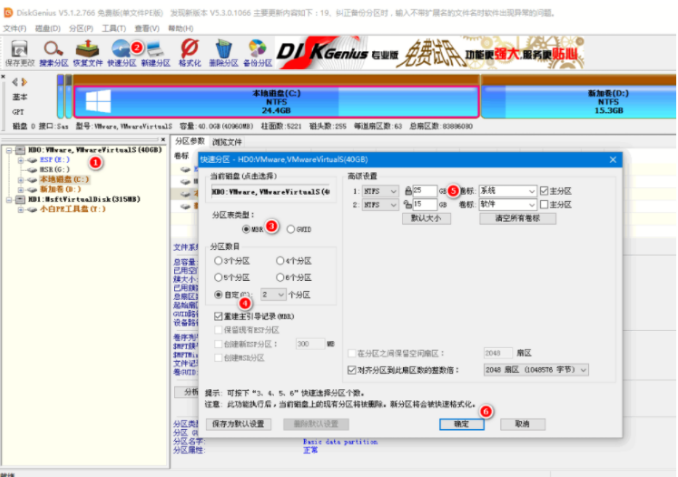 3、當進入到PE系統,如果需要分區,鼠標雙擊分區工具DiskGenius,點擊【硬盤】—【快速分區】;設置分區數目以及大小,系統盤35G以上,點擊確定,執行分區過程。