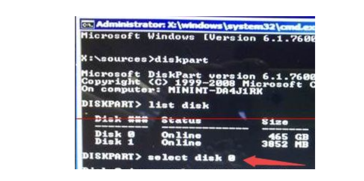 4、輸入【select disk 0】,按【回車】,即選擇disk 0為當前操作的磁盤。