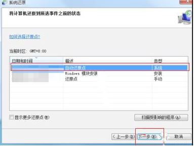 6、當彈出系統還原對話框時,選擇一個還原點,點擊下一步進行恢復。