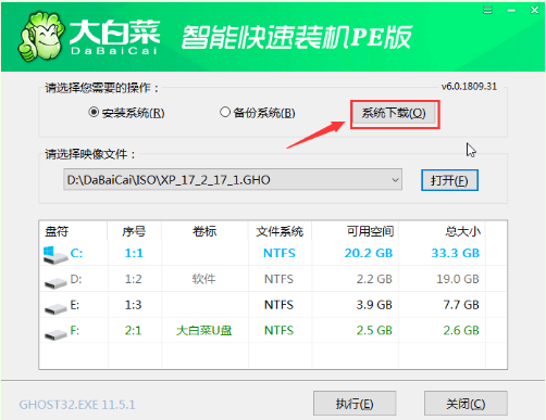 4.打開大白菜一鍵重裝后,如果沒有準備好系統鏡像,我們可以選擇在線系統下載
