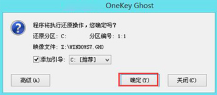5、接著會彈出一個詢問框,提示用戶即將開始安裝系統。確認還原分區和映像文件無誤后,點擊“確定”。
