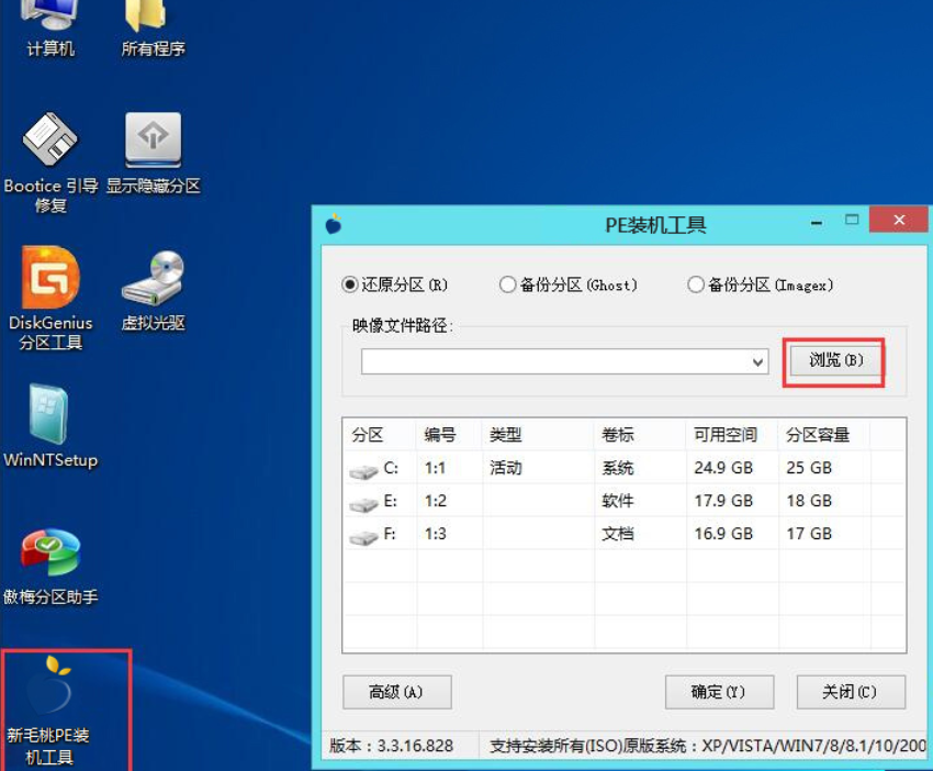 2、進入pe系統后,鼠標左鍵雙擊新毛桃PE裝機工具,打開后點擊映像文件路徑后面的“瀏覽”按鈕。