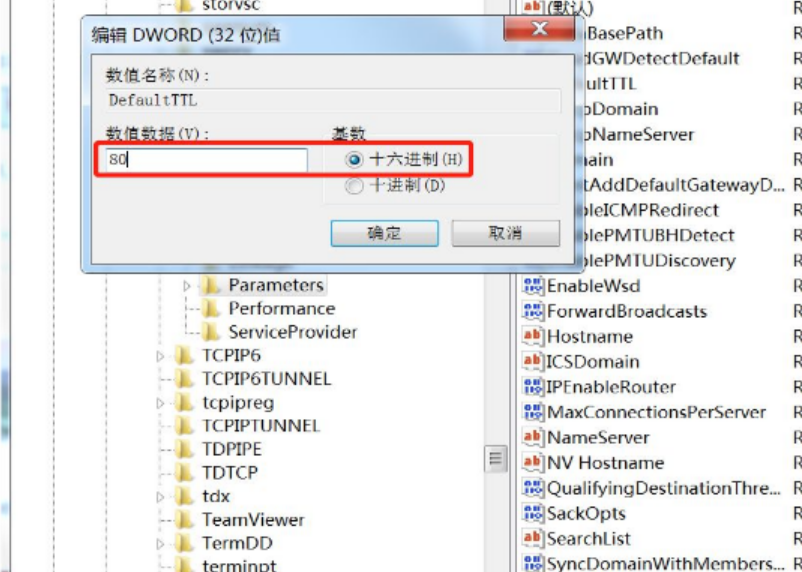 4、點擊參數,找到右邊的DefaultTTL,雙擊打開編輯,數值改為80(十六進制)。