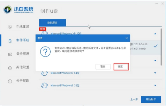 3、這時將會彈出格式化U盤操作,在確定保存好重要數據之后,點擊“確認”,等待U盤制作完成之后,重啟電腦即可。