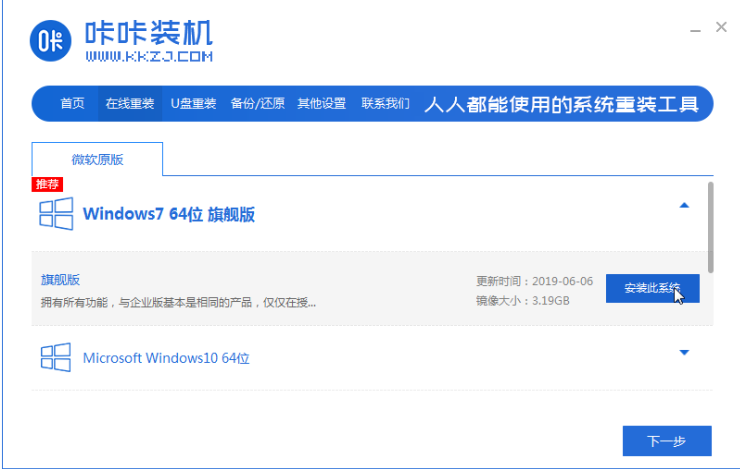 2、在線重裝功能板塊界面中,選擇win7系統,點擊安裝此系統,點擊下一步。