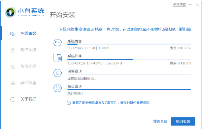 5、打開小白裝機工具,開始自動安裝系統鏡像文件等待安裝完成。