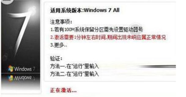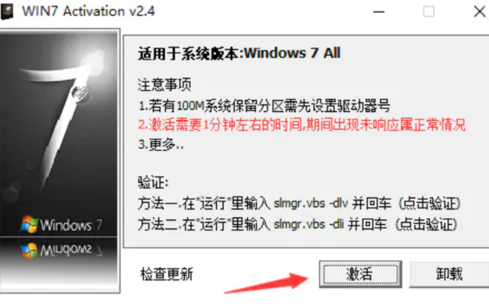 2、進入到win7激活工具軟件主界面,在界面中有注意事項和驗證等信息可以直接點擊激活選項,開始激活電腦。