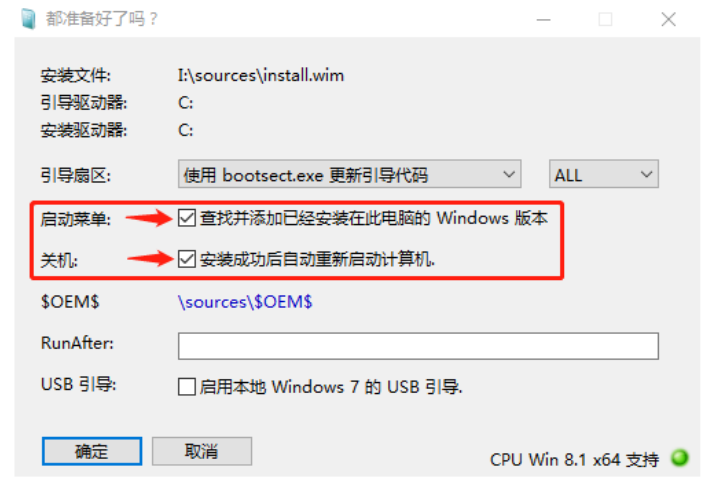 12、在彈出的確認窗口中勾選上啟動菜單修復與自動重啟,其它保持默認即可。