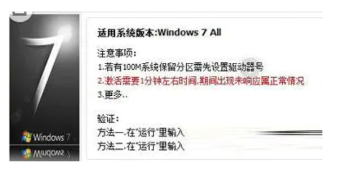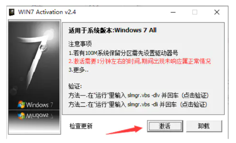 2、再進到win7激活工具軟件主頁面,在頁面中有注意事項和驗證等信息,在頁面下方還有激活和卸載兩種方式,可以直接點擊激活選項,激活電腦。