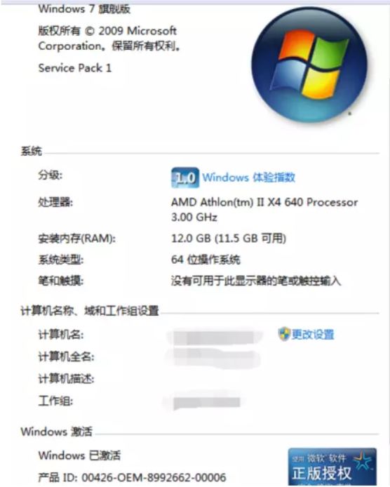 5.在您重新啟動電腦之后,單擊"我的電腦",選擇"屬性",您將看到WindowsUltimate64位操作系統已成功激活,如下圖:
