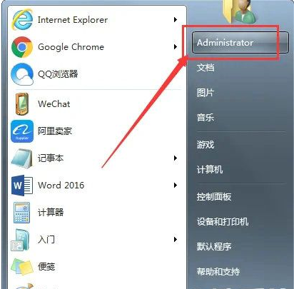 1、打開電腦的“開始菜單”,右上角找到“Administrator”進入。