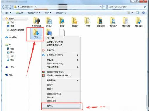 2、選中“下載”文件夾,鼠標右擊選擇“屬性”進入。