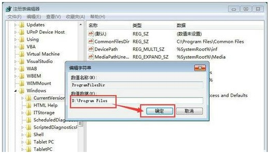 3、如果要將系統默認程序安裝路徑存至D:\Program Files,則在剛打開的數值修改窗口中修改為D:\Program Files。