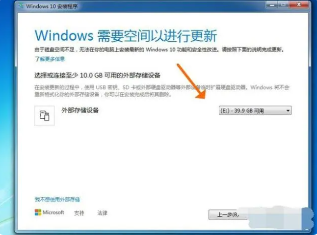 5、Win7升級Win10至少需要10GB的外部存儲空間,在外部存儲設備中選擇保存的位置,這里選擇一個除了C盤以外的分區比如E盤。