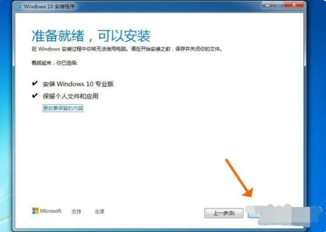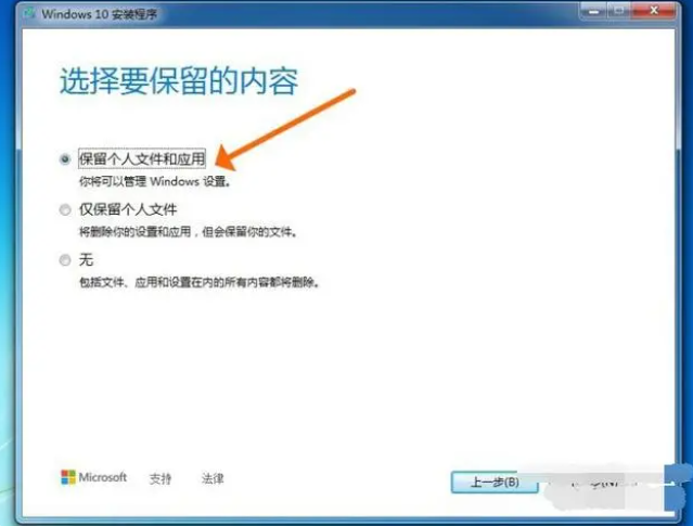 4、在“選擇要保留的內容”處點選“保留個人文件和應用”,這樣在Win7系統中的應用和文件數據在Win10安裝完成后就都會完整保留下來了。