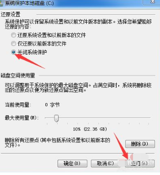 7、在“還原設置”區域,點擊“關閉系統保護”,點擊“應用”。
