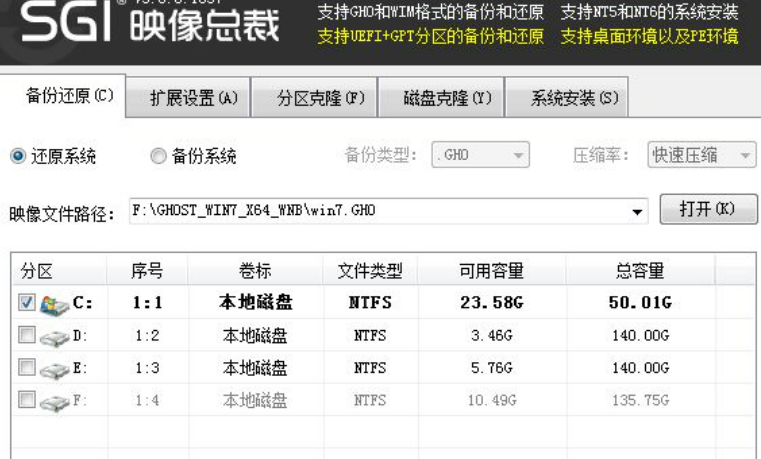 4、雙擊【安裝系統.exe】打開這個安裝界面,選擇【還原系統】,映像文件路徑選擇win7.gho文件,勾選要安裝的位置C盤;