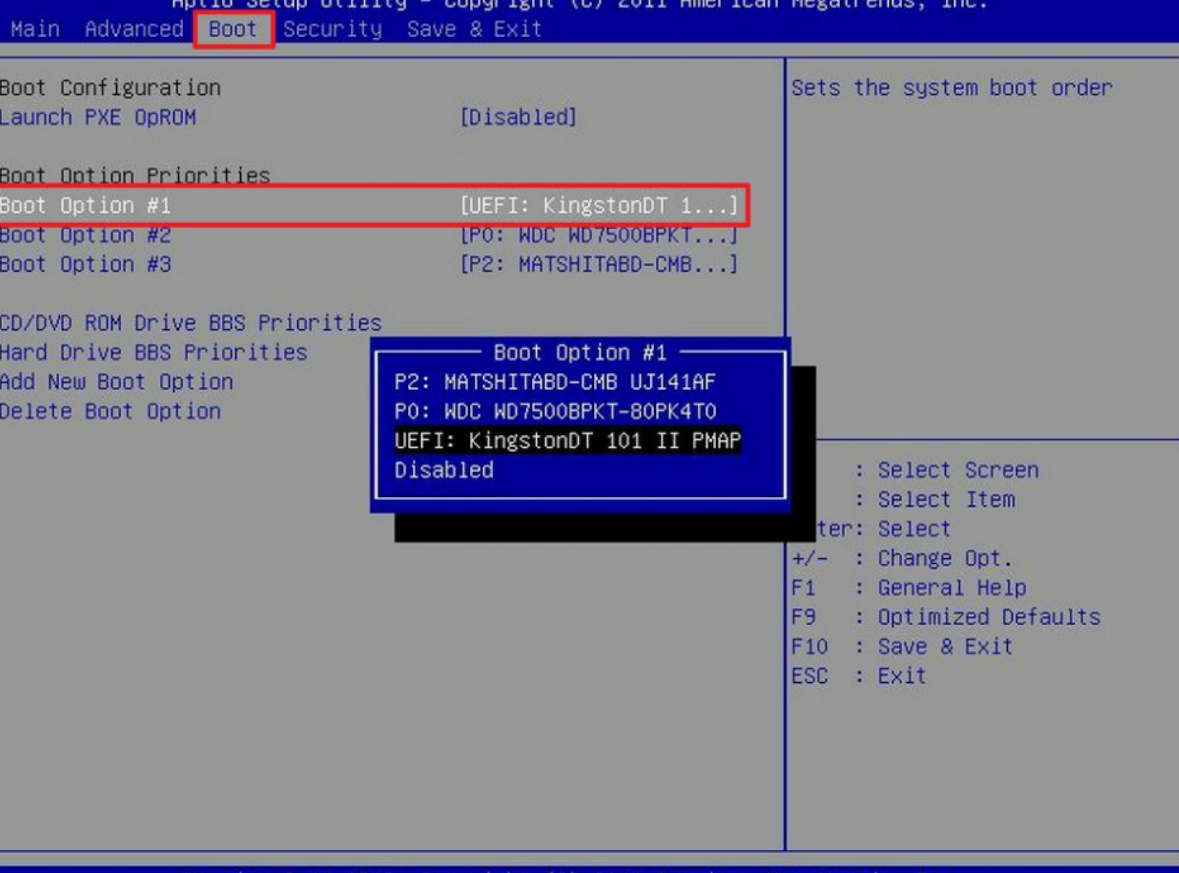 6、進入頁面后在Boot里選擇Boot Option #1,隨后再選擇UEFI:KingstonDT 101 II PMAP。