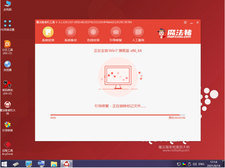 5、當電腦來到pe系統后,魔法豬裝機工具將會自動開始安裝win7系統。