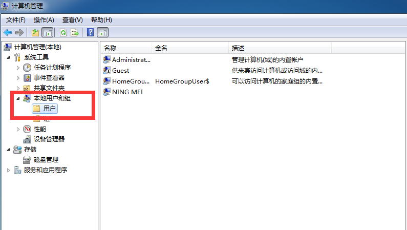 3、在左側窗口界面中點擊本地用戶和組,點擊用戶。