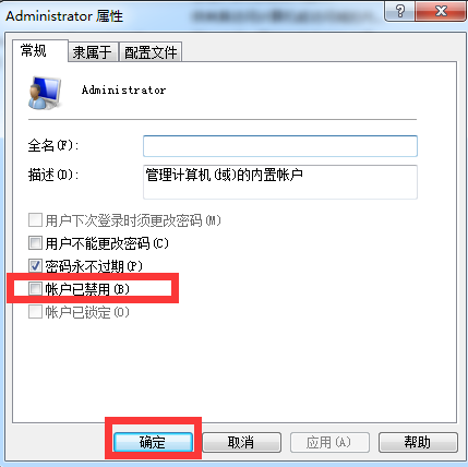 4、打開管理員賬戶,取消勾選賬戶已禁用,點擊確定即可。