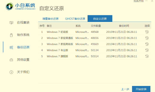 1、下載并點開小白系統軟件,點一下備份還原——自行還原,小白會自動鑒別出我們下載的深度win7 旗艦版系統文件,識別出來后點下一步。